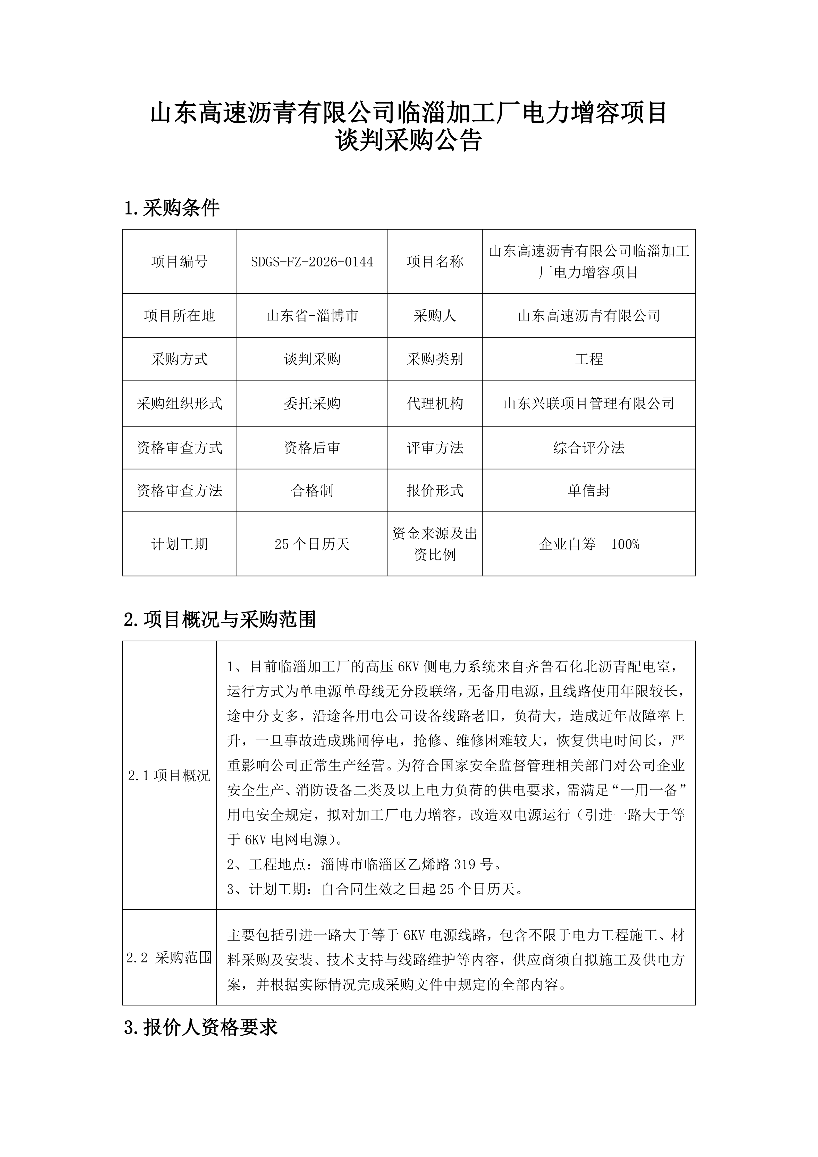 山东高速沥青有限公司临淄加工厂电力增容项目谈判采购公告
